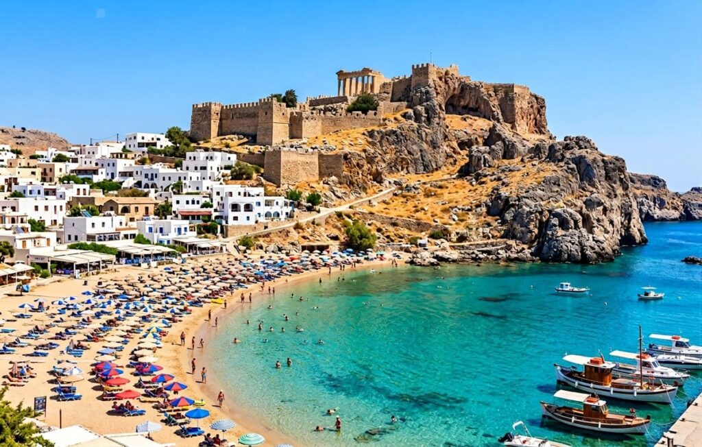 Dar Rodos nu se oprește aici. Imaginează-ți că te relaxezi pe o plajă cu vedere la o acropolă antică. Această experiență unică te așteaptă la Lindos Beach.