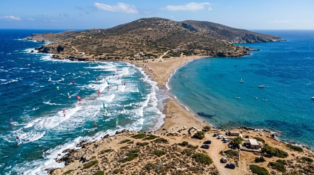 La capătul sudic al insulei, acolo unde Marea Egee și Marea Mediterană se întâlnesc, se află Prasonisi — un loc cu adevărat unic, cunoscut și sub numele poetic de „Sărutul mărilor”. O peninsulă îngustă de nisip leagă insula principală de o mică insulă, creând două lumi distincte: pe o parte, Marea Egee agitată, cu vânturi puternice și valuri înalte, ideală pentru surferii experimentați; pe cealaltă, Marea Mediterană mai blândă, cu ape calme potrivite pentru începători sau pentru cei care preferă relaxarea.